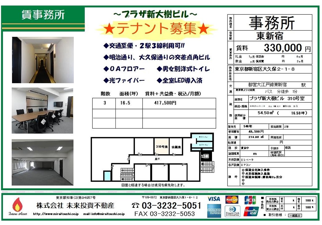【貸事務所】都営大江戸線/東新宿駅/徒歩1分/54.50㎡/賃料363,000円/プラザ新大樹ビル|株式会社未来投資不動産|東京都 新宿区大久保駅周辺にて不動産(賃貸、売買、マンション アパート)をご紹介